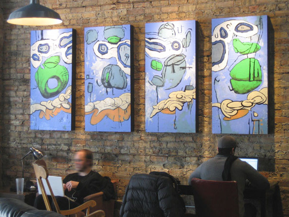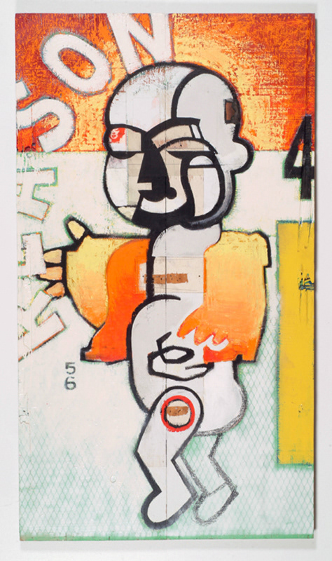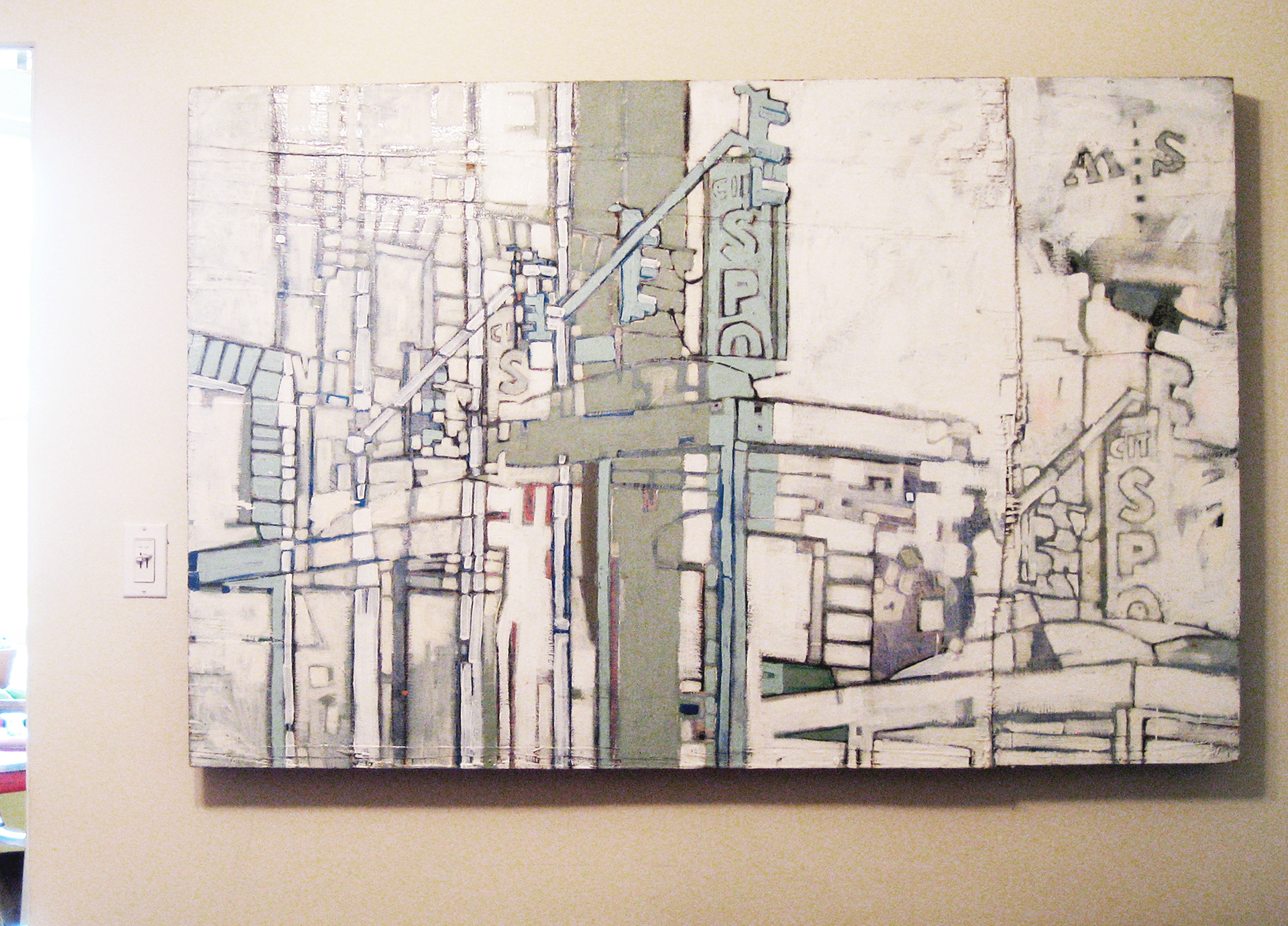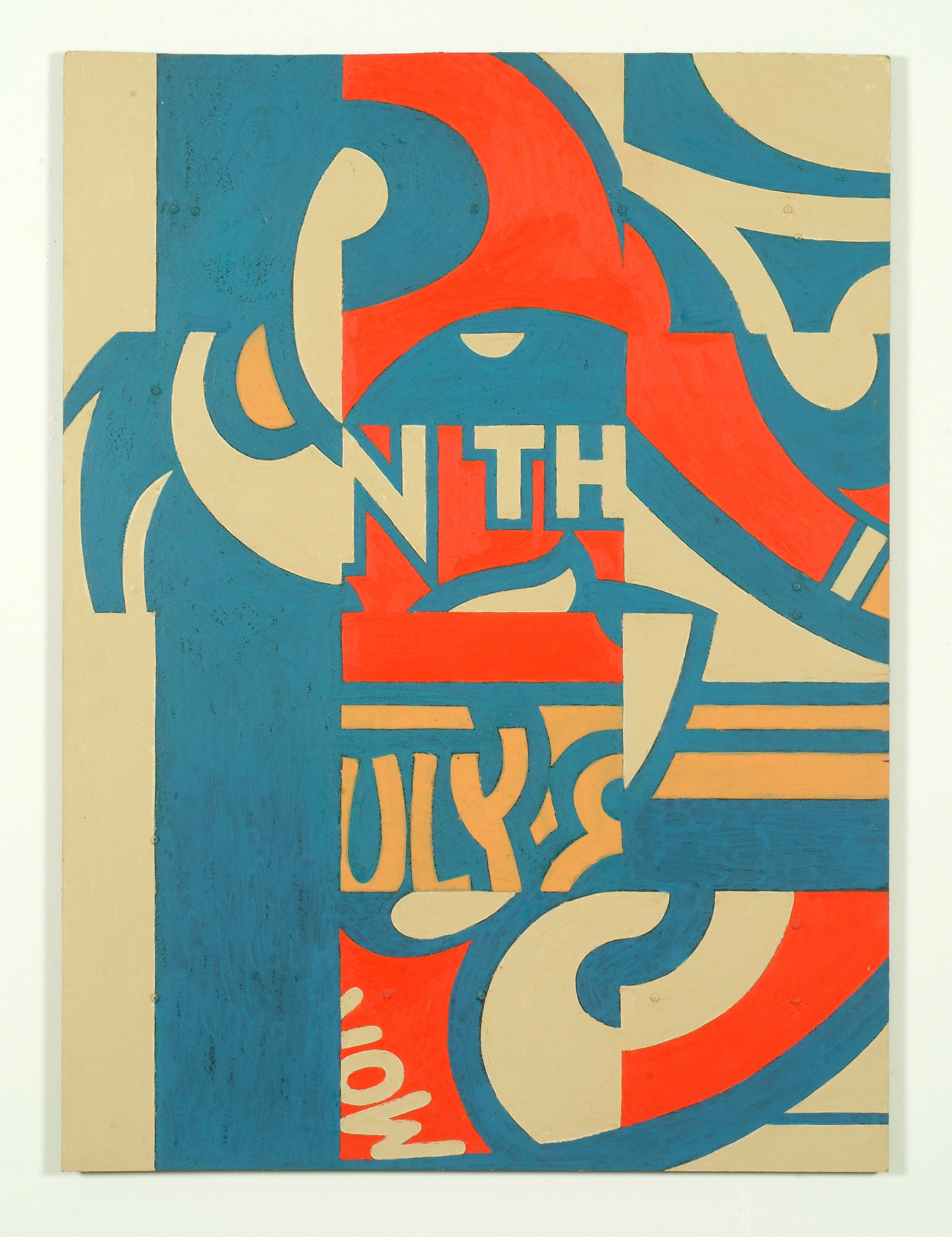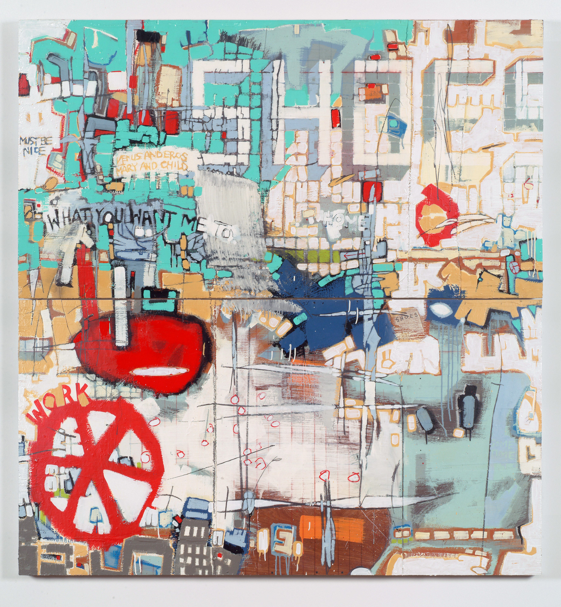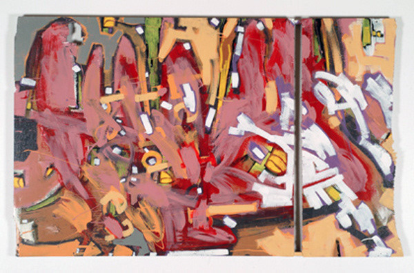 (behind sculpture by Jake Webster) Banner Series, acrylic, enamel, spraypaint and graphite on paper pulp, 40 x 72 inches, 2002