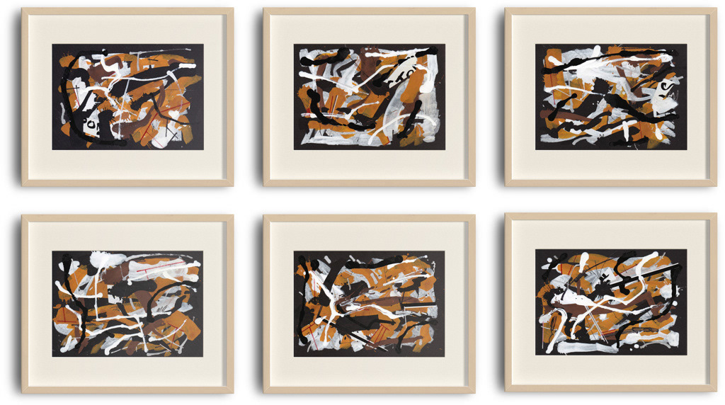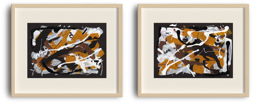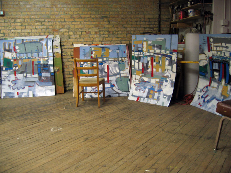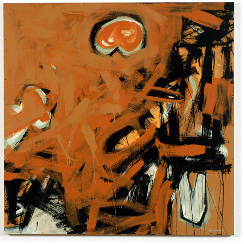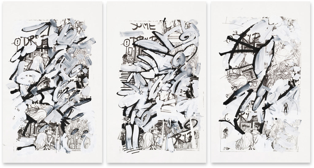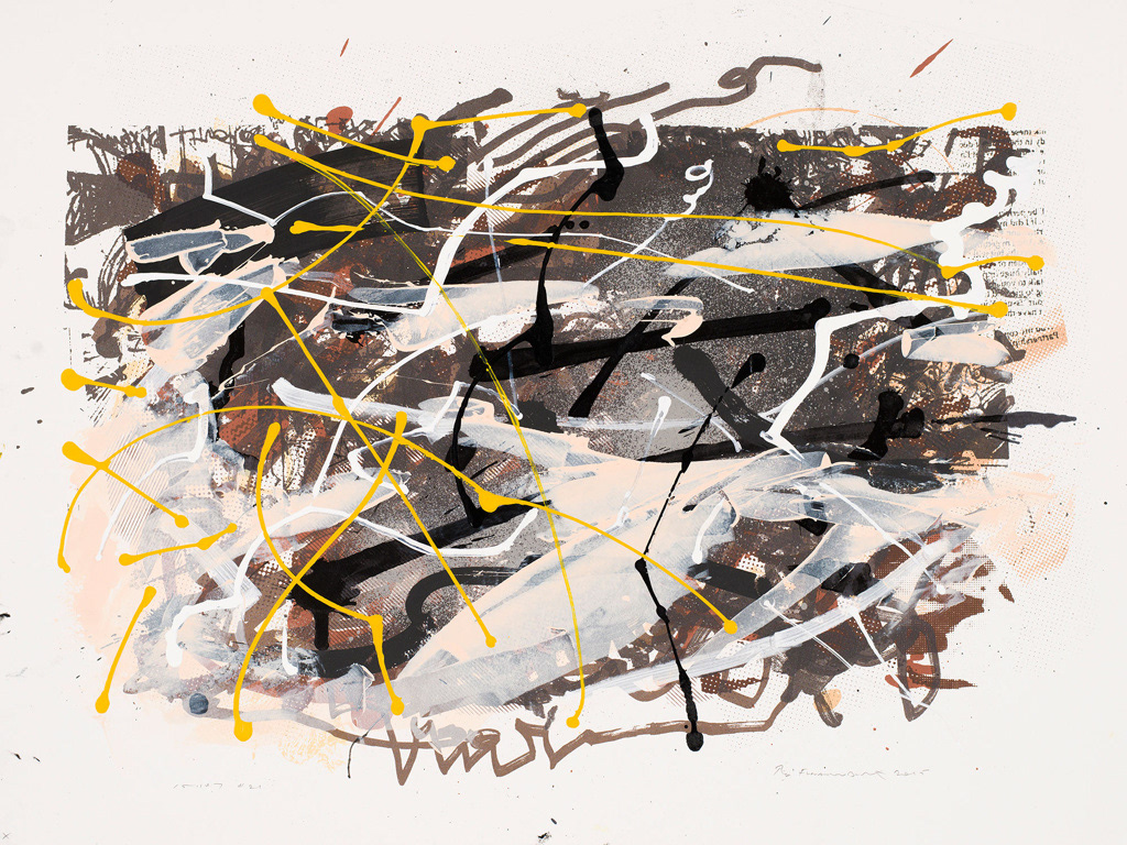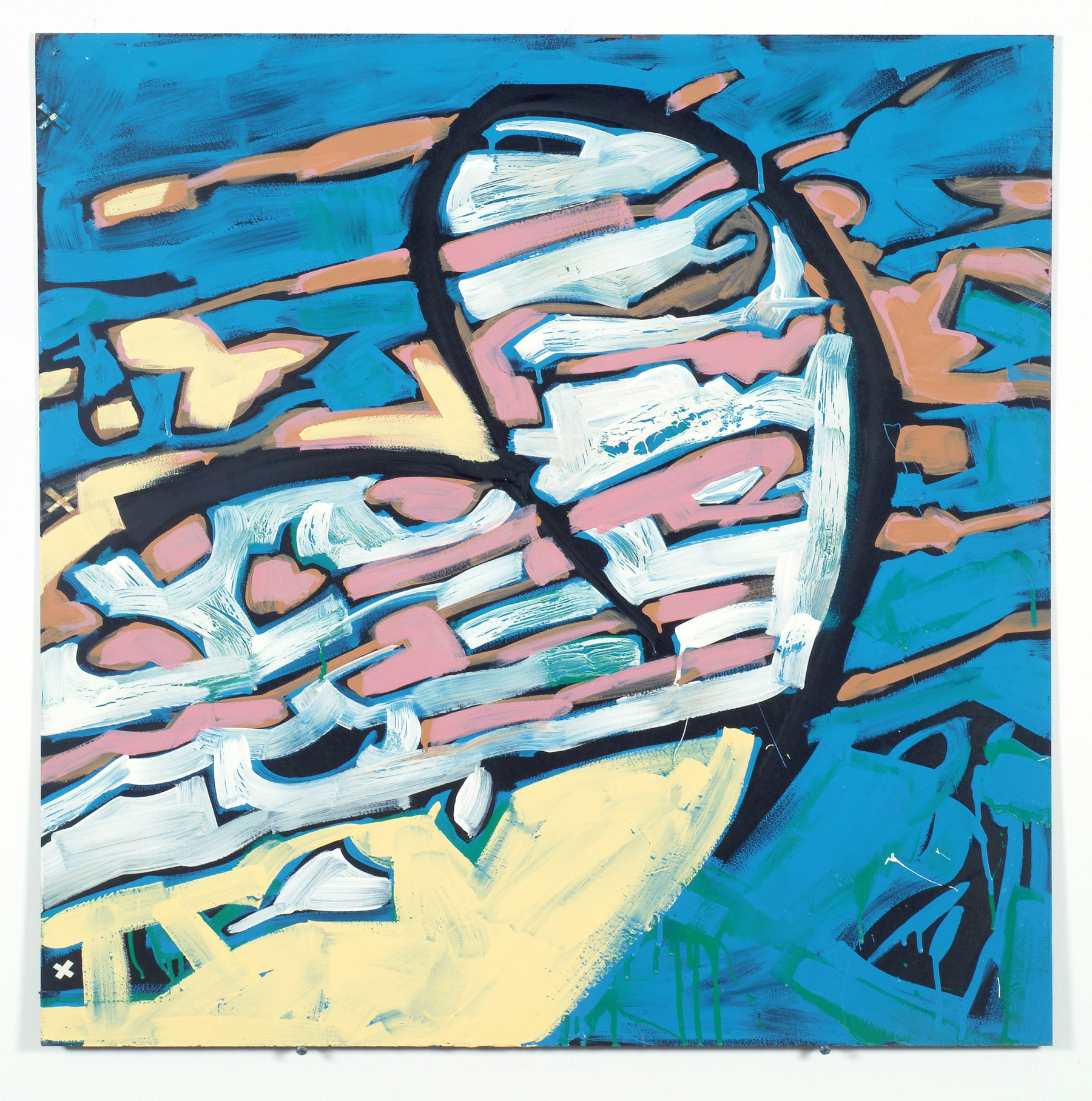 (behind sculpture by Jake Webster) Banner Series, acrylic, enamel, spraypaint and graphite on paper pulp, 40 x 72 inches, 2002